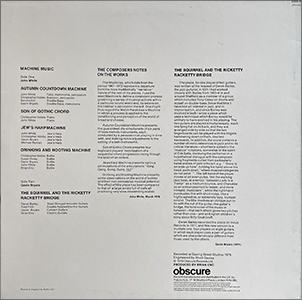 誰でも参加できる玄人素人混成の即興の庭The Scratch Orchestraへの参加を経て、ある種のゲーム性や数値システムを取り込んだ独自の方法論に基づく作曲に取り組む鬼才John White。英Obscureから発表した78年作。Christopher Hobbsとのピアノ重奏『Son Of Gothic Chord』など、限定された楽器(空き瓶、口琴など)と一定の規則に従って演奏するミニマルミュージックの変種を収録。どこまでも逸れていく虚ろな彷徨い感に同様の中毒性があるGavin Bryarsサイドには、Derek Baily、Brian Eno、Fred Frith、自演を含む、三半規管揺さぶるギター四重奏を収録。赤ピンクラベルオリジナル盤。大推薦盤!