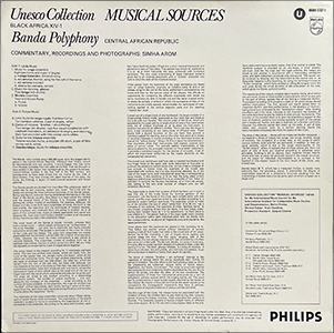 ユネスココレクションの一枚として76年に発表された、中央アフリカ共和国に住むバンダ族各支族のポリフォニー音楽。木の幹や根、動物の角などから作られる、オンゴと呼ばれる原始ホルンの集団合奏を中心に収録。試聴は、身の丈程もある巨大オンゴを含む、総勢18名に及ぶバンダ・リンダ族のオンゴオーケストラから。リズミカルな掛け合いの反復からおもむろに吹きあがる野太い咆哮。焦点のずれたリズムの応酬から強力なグルーヴが立ち上がってくる圧巻のパフォーマンス。極めて洗練された多声感覚に圧倒される音声のみの掛け合いも。ピグミー声楽研究の第一人者でもある、音楽学者Simha Aromによる録音。大推薦盤!